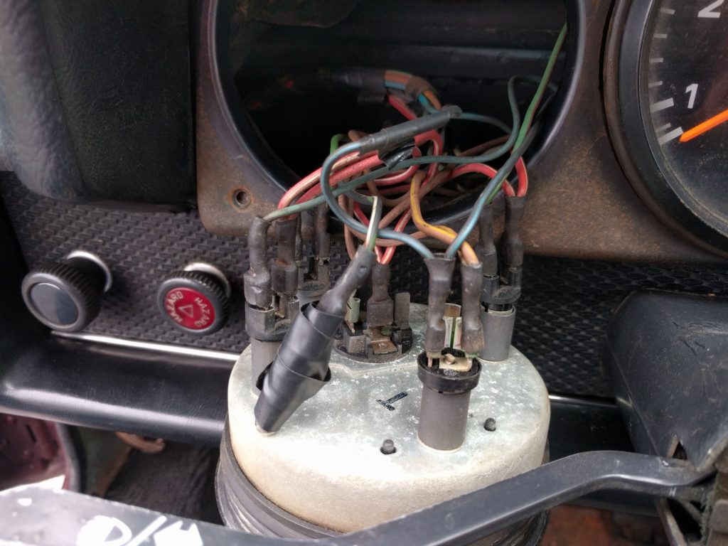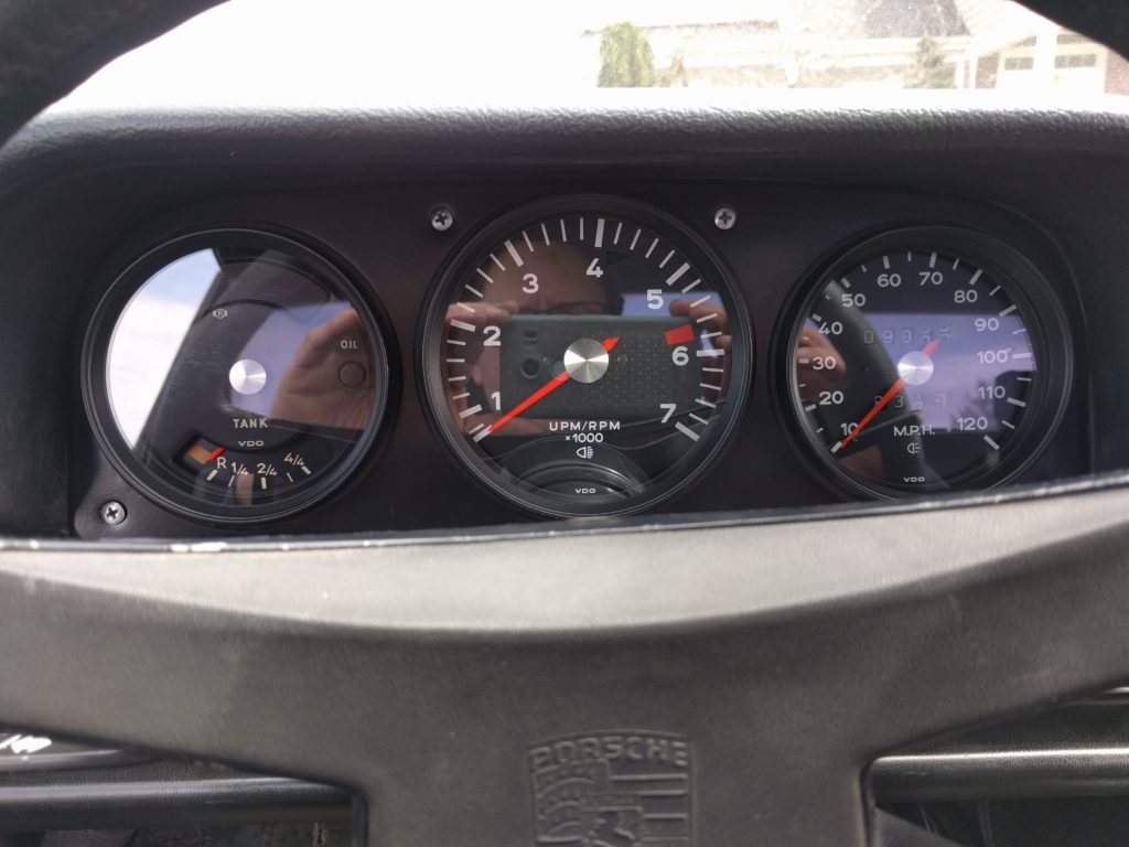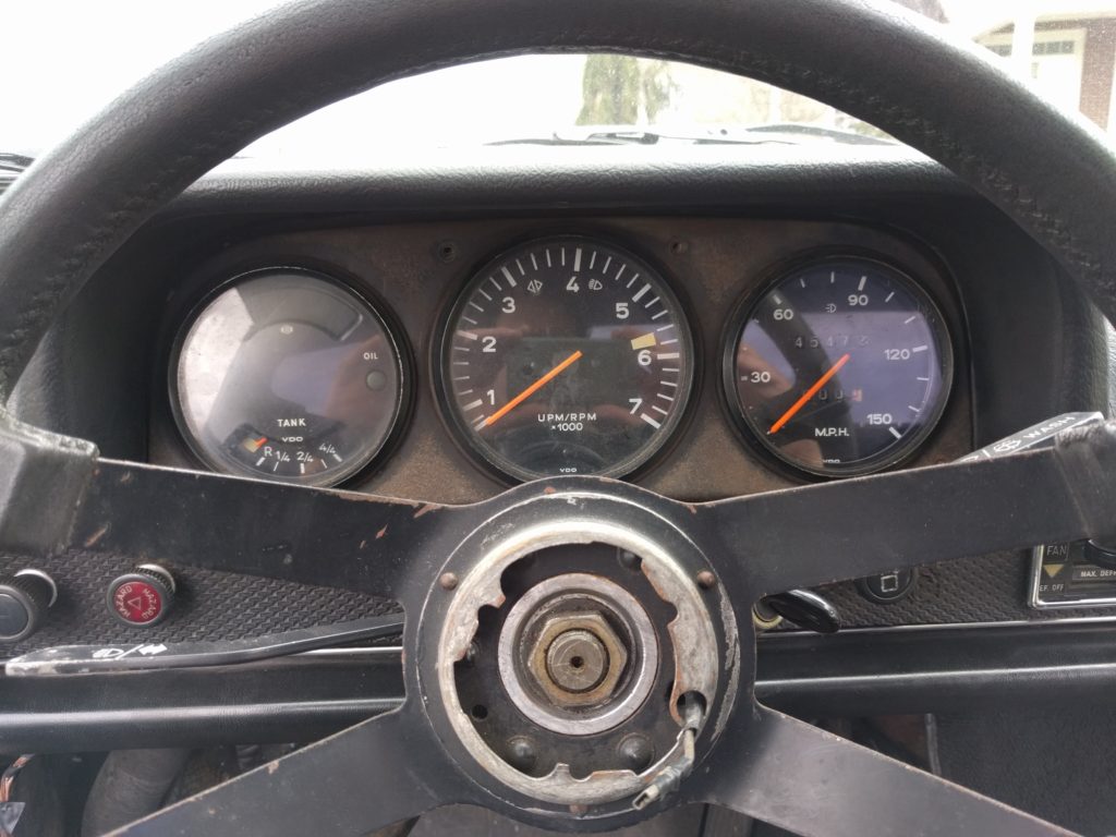 In 1974 Porsche de-contented the 914. They formulated appearance package items as optional, offered painted instead of chrome bumpers and changed the gauges from metal button needles to black plastic. The gauge glass was now plastic too. I happen to like metal button gauges and chrome bumpers without tits so this car is getting back dated. I pulled apart an old set of gauges, restored the rings plus cleaned the glass, and used a powder coated gauge surround to complete the swap out. I felt my Edd China taking hold when I pulled out the gauges to reveal a mess of wires. How you ever watched him yank apart the Lotus Espirit interior? Yikes. It a little intimidating knowing you need good notes or good pictures less your oil light blazes your turn signals. I’ve done many one gauge at a time swaps but when you remove the surround, all three measuring sticks need to come out before you can put it back together. Job done. I’m now looking at a ’71 dash which is so much more pleasing to me.