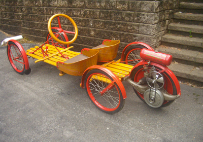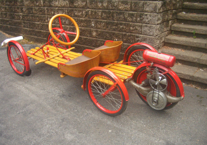 “1919 BRIGGS & STRATTON FLYER – excellent condition, took a “First Prize – a “Junior” at Hershey, 1966. The slats have been replaced with new ash ones and the wheels were rebuilt to accept modern tires. All other items are original but restored.”