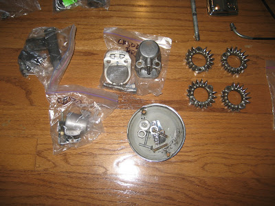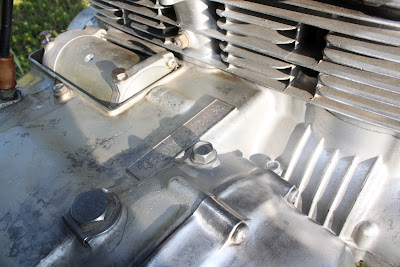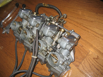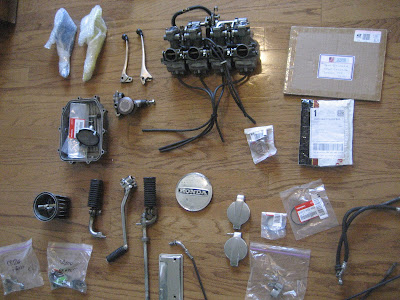 The exhaust on the parts bike is a four header system that goes into two pipes, one on each side.  It was my intention to move this assembly over as it is in pretty good shape.  Original exhaust systems are still available on eBay or they do make an aftermarket four pipe system exactly like the original.  The parts bike motor is complete, 13,455 miles and has good compression as well.  Also included on that bike are the carburetors.