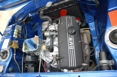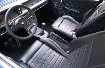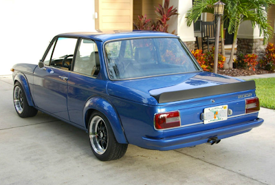 “1974 BMW 2002, finished in stunning Estoril Blue (a factory color introduced on the M3) with black interior. Full cosmetic restoration, with Turbo body kit, including flares, front valence, trunk spoiler, and matching lightweight rear bumper with center exhaust. The interior has also been completely reupholstered with new carpet, headliner and door skins, as well as E30 sport front seats and rear bench completely redone in new black vinyl with an accenting carbon fiber weave-patterned vinyl inset. The latter material is also used on the custom center console, which houses 3 new VDO gauges and the radio.