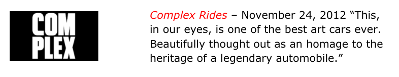 • Complex Rides – November 24, 2012 “This, in our eyes, is one of the best art cars ever. Beautifully thought out as an homage to the heritage of a legendary automobile.”