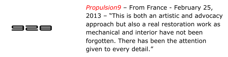 • Propulsion9 – February 25, 2013 – “This is both an artistic and advocacy approach but also a real restoration work as mechanical and interior have not been forgotten. There has been the attention given to every detail.” — France