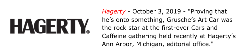 • Hagerty– October 3, 2019 – “Proving that he’s onto something, Grusche’s Art Car was the rock star at the first-ever Cars and Caffeine gathering held recently at Hagerty’s Ann Arbor, Michigan, editorial office.”