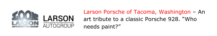 • Larson Porsche of Tacoma, Washington – An art tribute to a classic Porsche 928. “Who needs paint?”