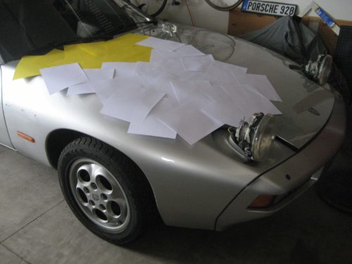 My vision was then to randomly cover the car as I worked. Random so to not detract from Tony Lapine’s brilliant design. Each sticker, which is one of 32 individual pages printed in 10 sets, were carefully and thoughtfully placed. Having the ability to change out damaged stickers over time that may result from peeling, weathering or scrapes/chips was the reason I chose not to clear coat the car when finished. Additionally, I added three stickers from the movies that adorned the 928 and I liked: Weird Science, Scarface and Risky Business. The European Car of the Year sticker with proper logo from 1978, purchase through eBay in Europe, is in full color above each side marker light.