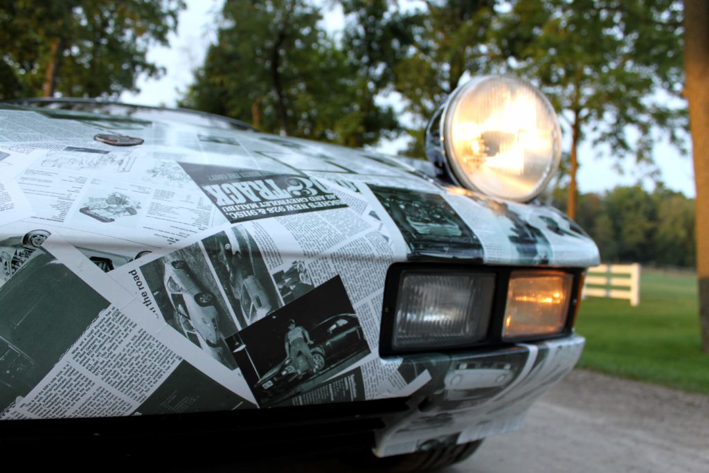 This is not a vinyl wrap as commonly thought but rather 300+ pages 8.5″x11″ vinyl stickers, cut into thousands of pieces. Each image was scanned from either the original 1970’s magazine bought on eBay or a book. The scans were retouched and converted into black and white files then printed on bumper sticker material.
