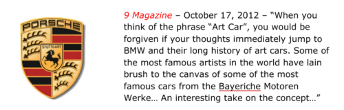 • 9 Magazine – October 17, 2012 – “When you think of the phrase “Art Car”, you would be forgiven if your thoughts immediately jump to BMW and their long history of art cars. Some of the most famous artists in the world have lain brush to the canvas of some of the most famous cars from the Bayeriche Motoren Werke… An interesting take on the concept…”