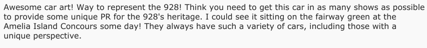 The convictions above drove me to buy and create the Porsche 928 Press Tribute Art Car. As an owner of a ’83 911SC, ’71 911, 944 Turbo and 914s plus restorer and engine re-builder of a ’66 912 how could I ignore the genius of the 928? I was tired of hearing lackluster appreciation for the car except from those who owned them. So it had a liquid cooled engine in the wrong end. So it wasn’t as raw as the tail wagger. It wasn’t designed to be. It was and is one of the greatest GT cars ever made as evidenced by the buff books that wrote about it. I therefore decided it was easier to let people read for themselves rather than me try to explain it.