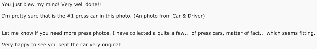 • Car and Driver – November 24, 2012 – “Grusche is hoping Porsche AG will take enough interest in the car to eventually display it at the company’s museum in Zuffenhausen.”