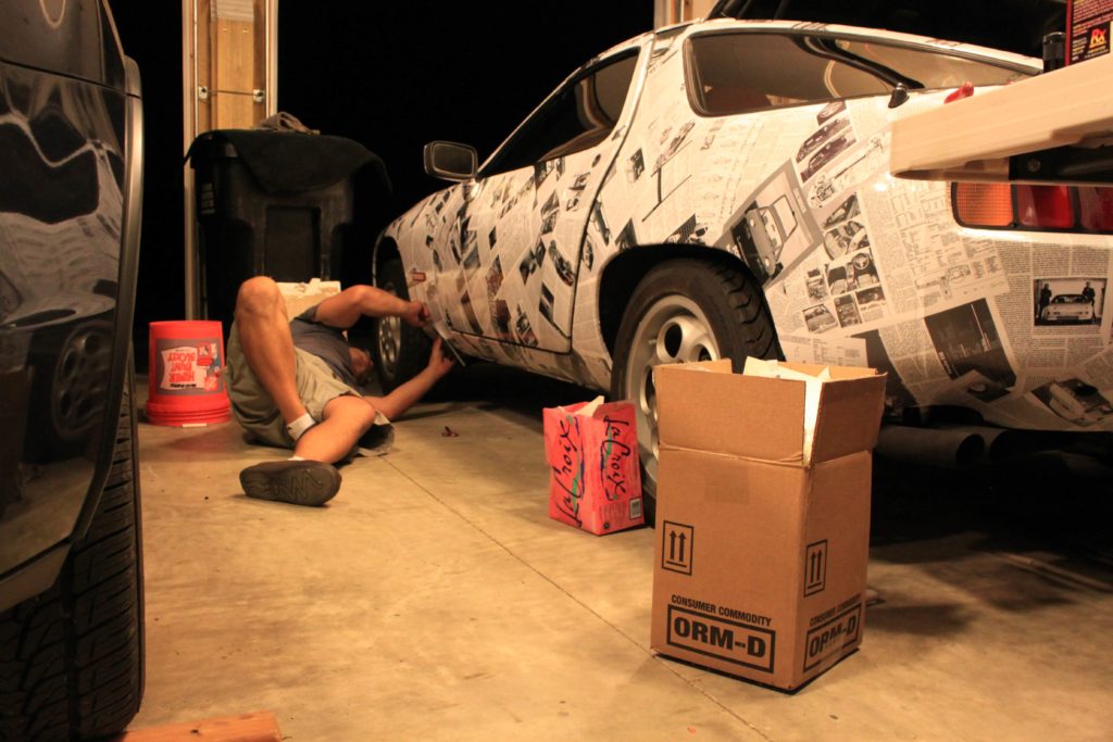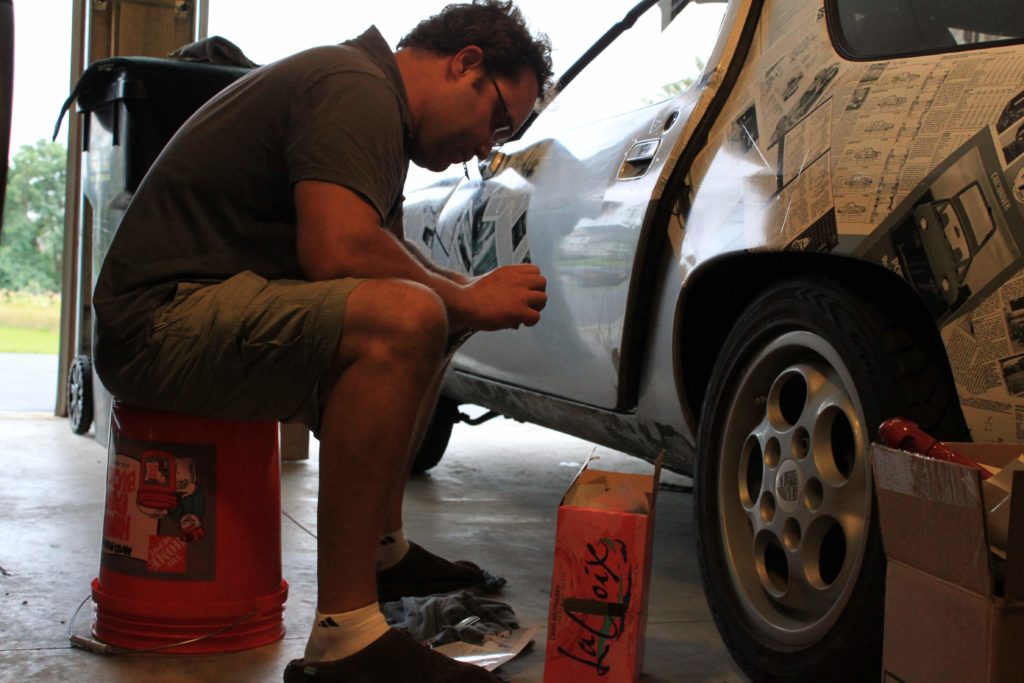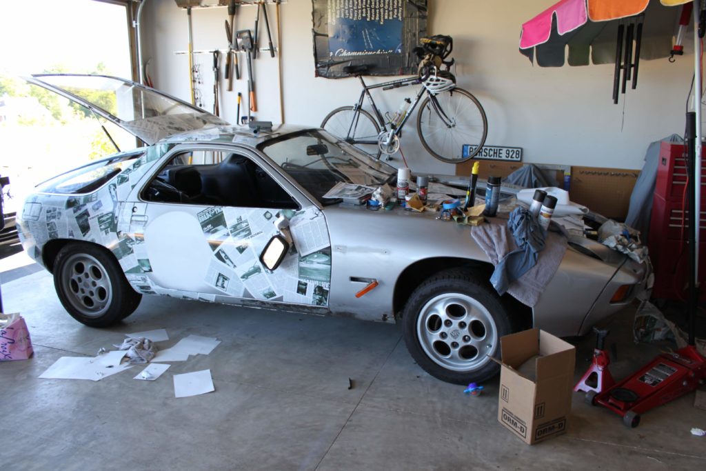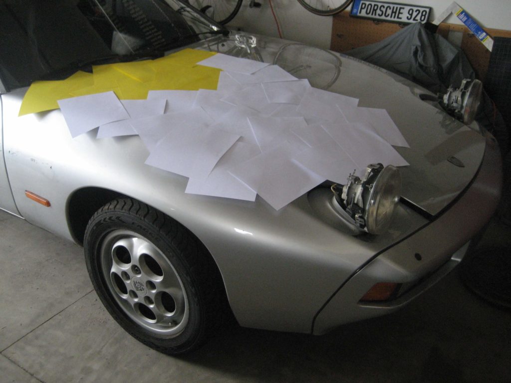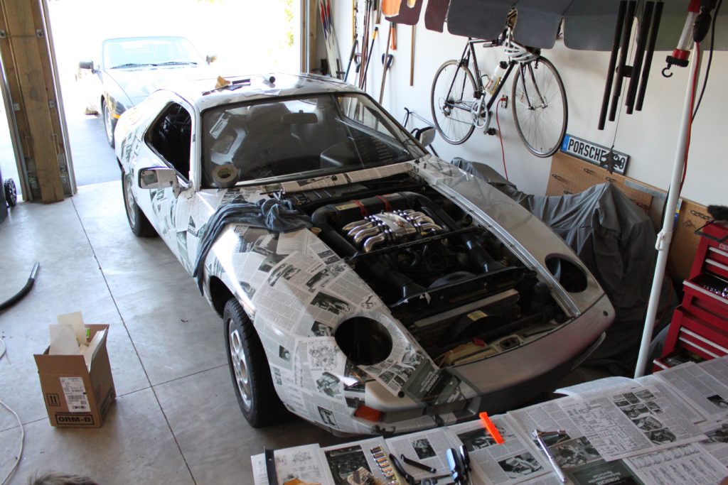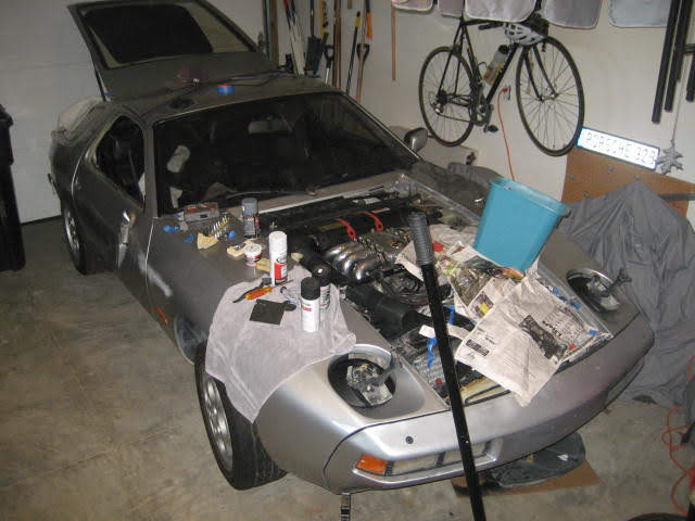 The tear down., hood off. Prepping the car and painting the headlight surrounds for the chromed buckets.