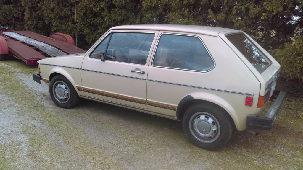 There is nothing particularly exciting about this car other than superbly rust free and only 25,000 miles. It’s an automatic. It’s beige. It’s got a upside down frown, banana looking steering wheel. Given that it is parked next to a trailer, I imagine the owner bought it out west for $1000 bucks and brought it home for a flip. Still when you looked at more than a few for your first car as I did, it has its appeal.