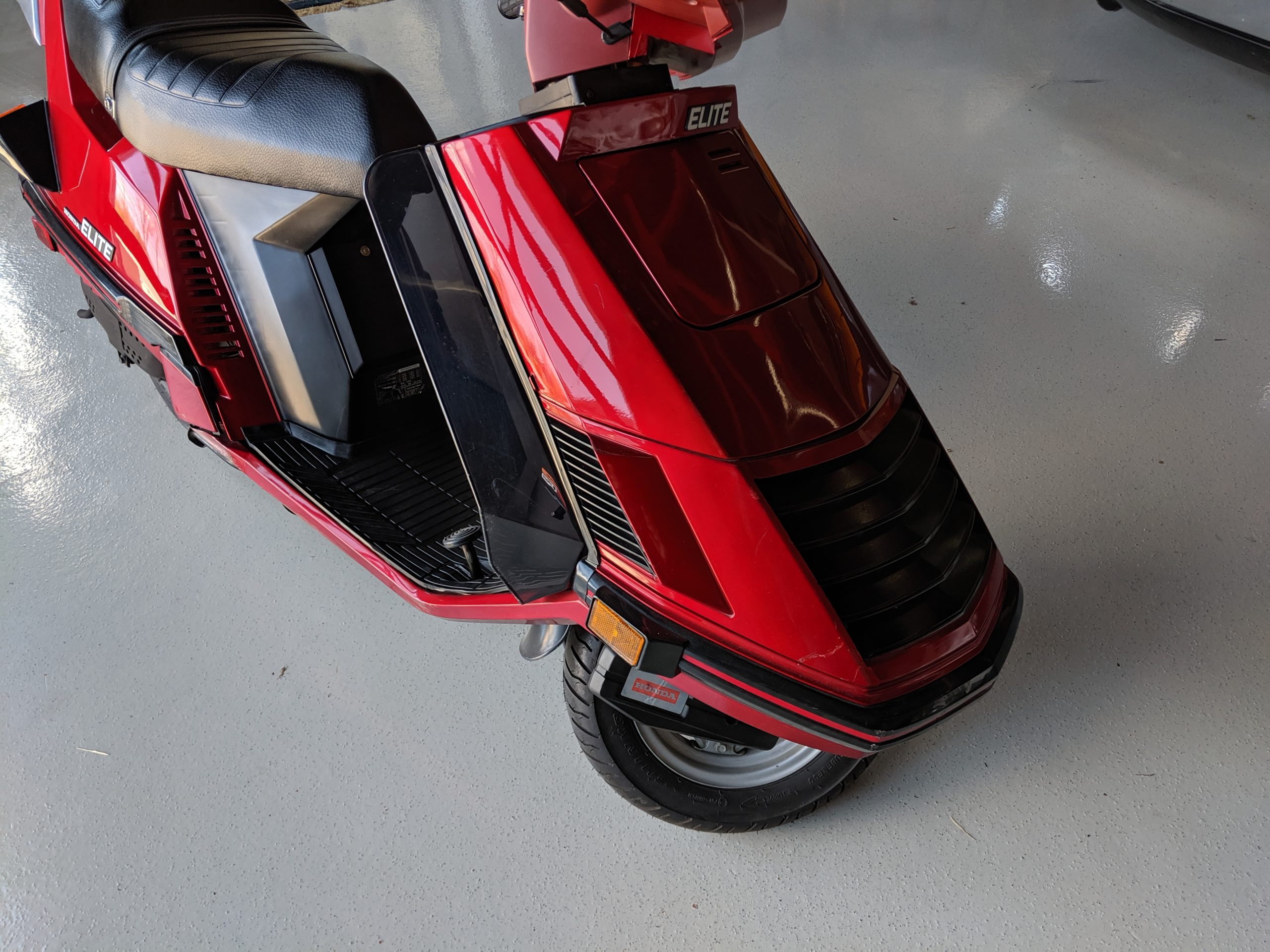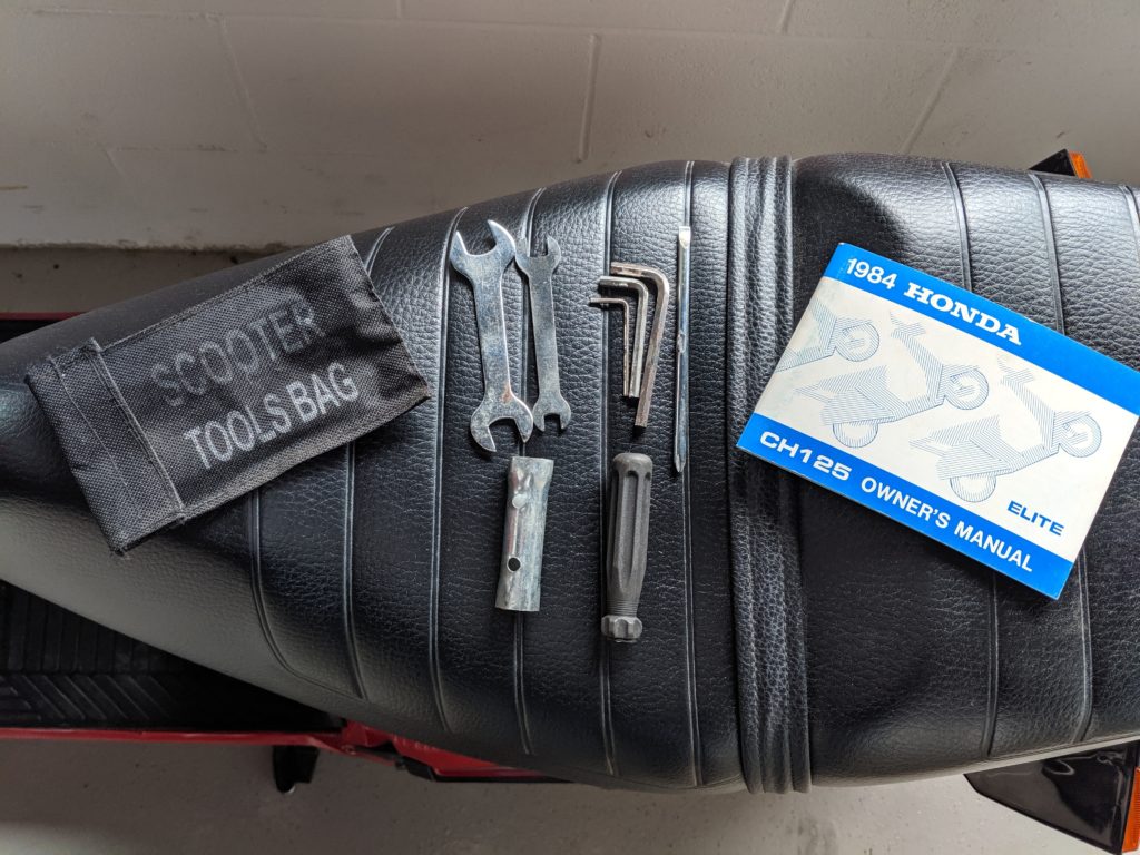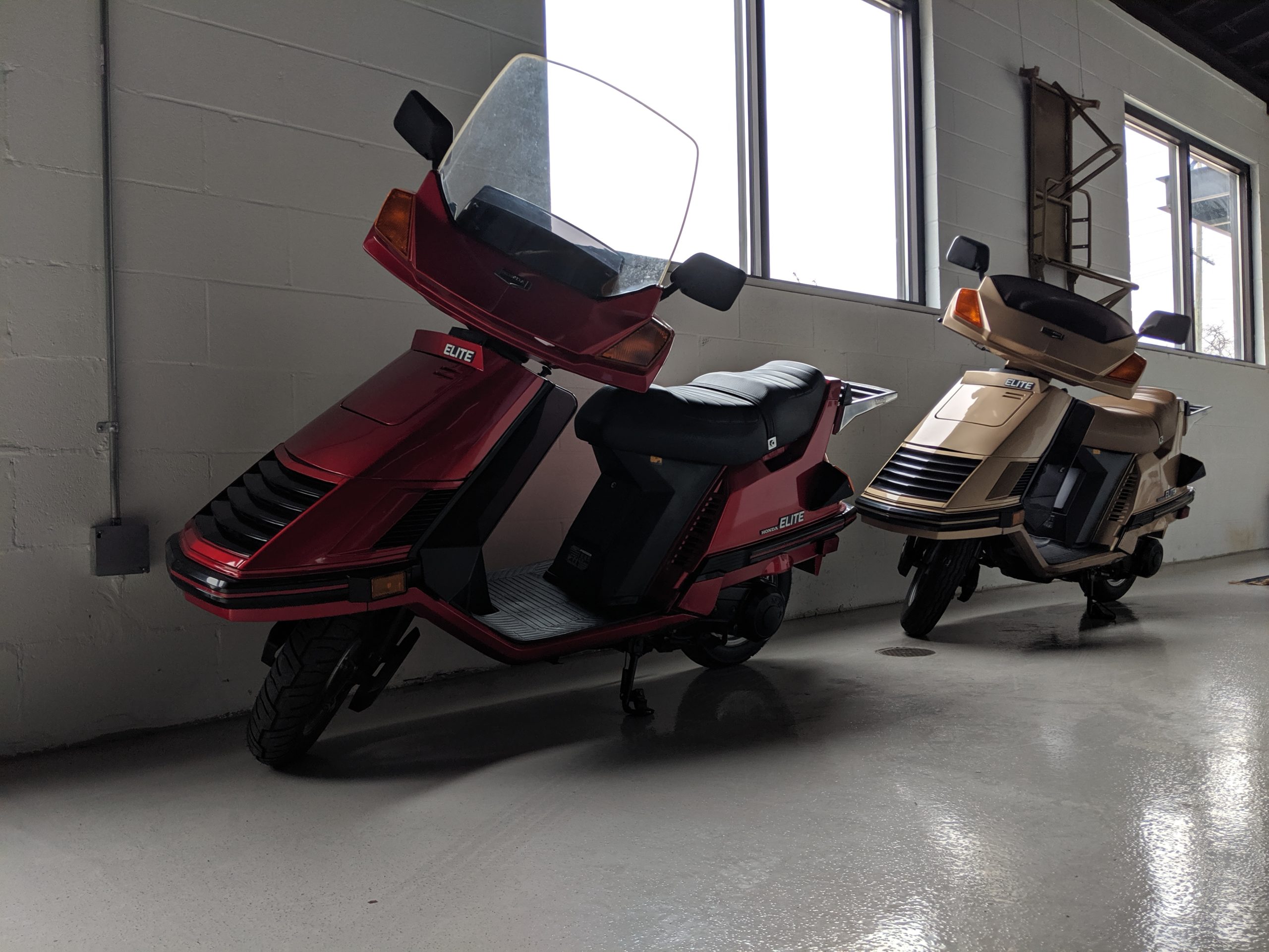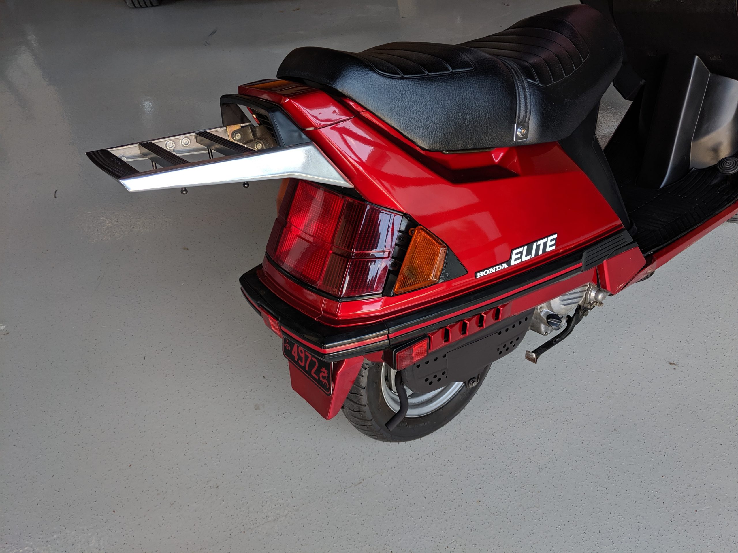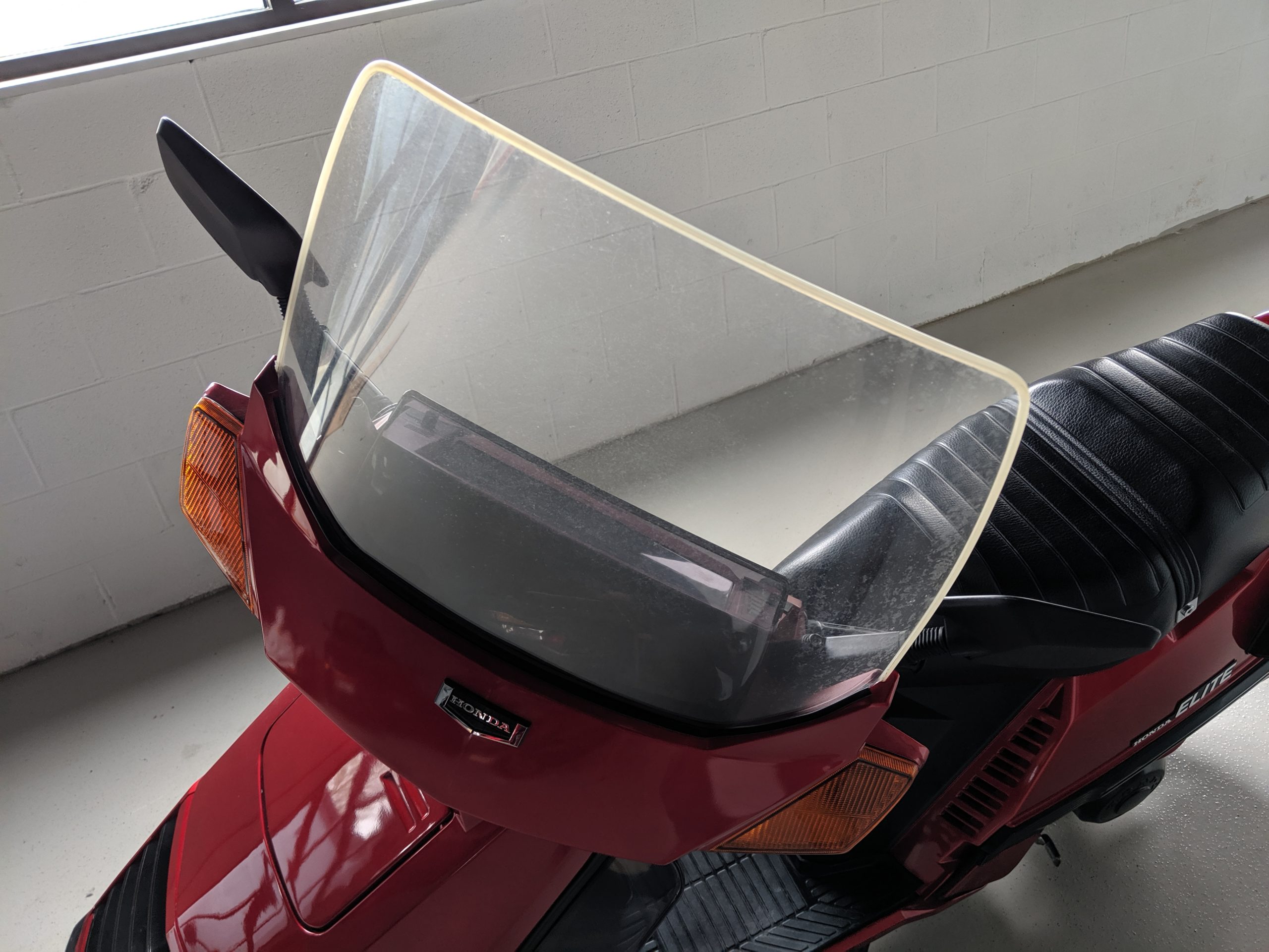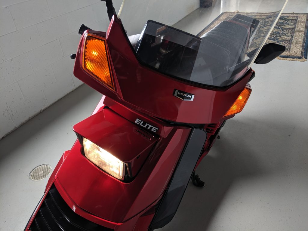 This first and only year 1984 Honda Elite 125 was purchased last year. The Honda Elites are the only scooter ever made with a pop up headlight. The 125 was only made in ’84. Honda continued the popup headlight in the 150 Deluxe for ’85 and ’86. The added power was a welcome addition before Honda discontinued their mid range scooter in favor on the 250cc and 80cc.