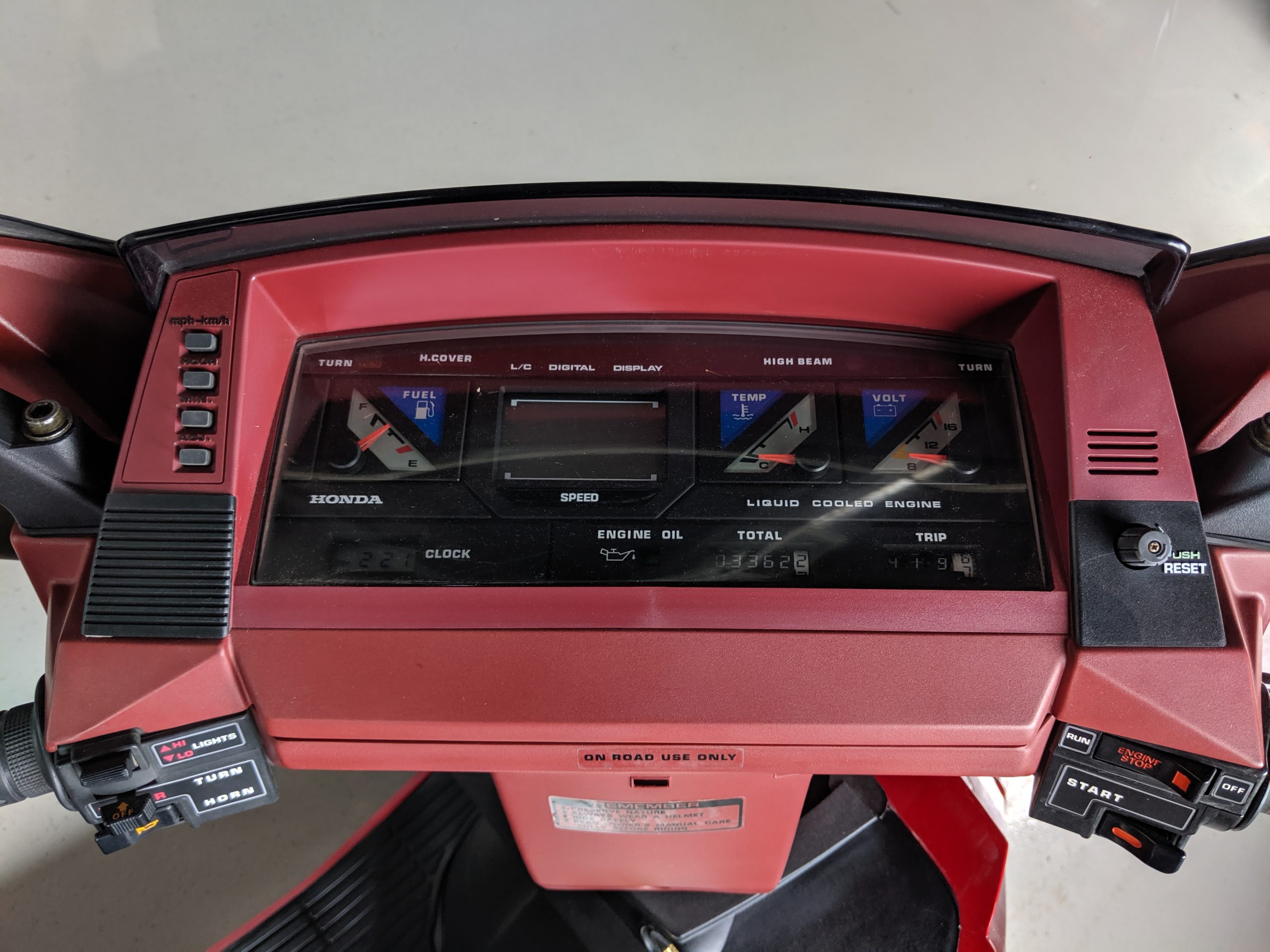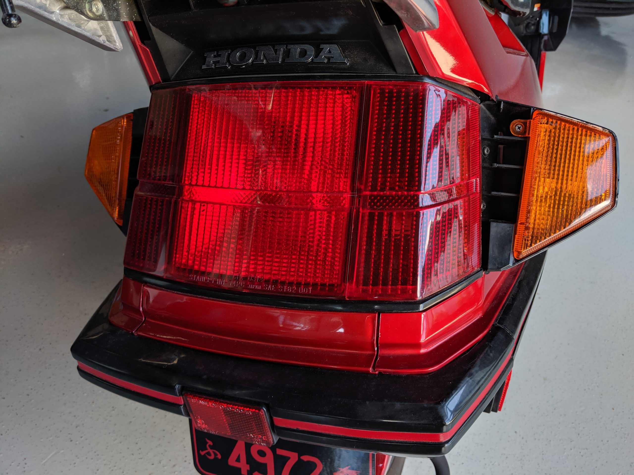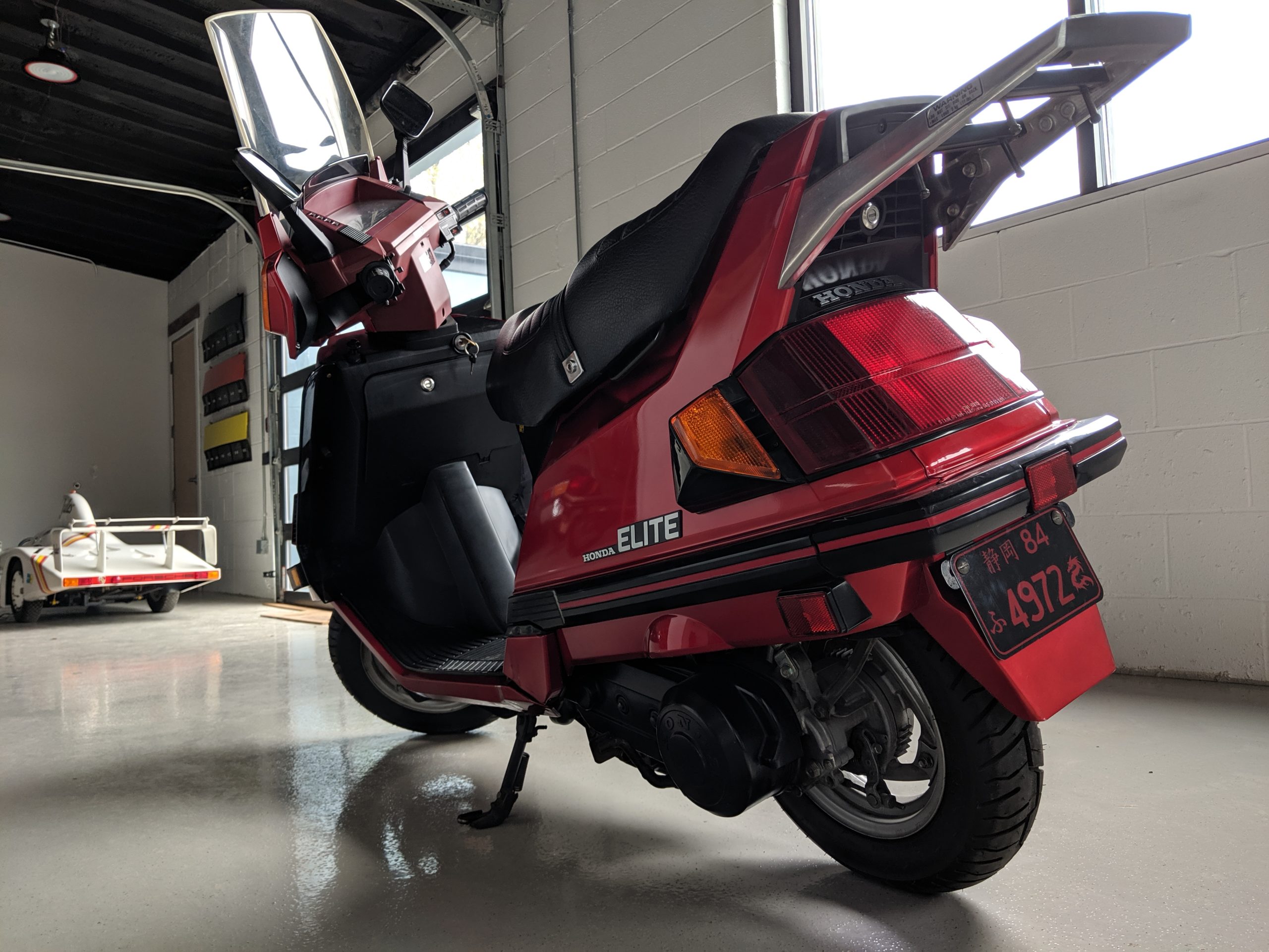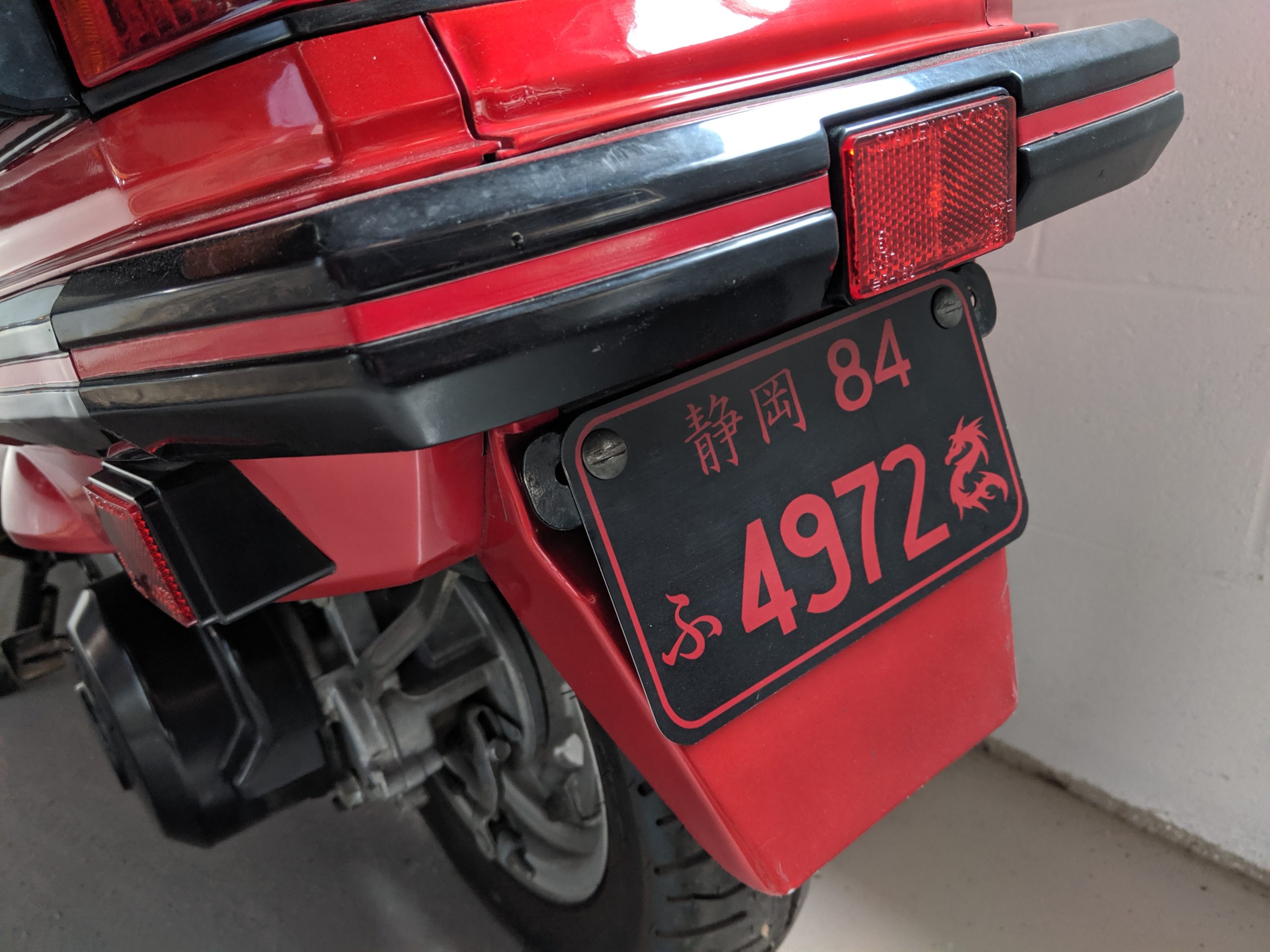 - Custom license plate: symbol for the prefecture, Shizuoka, where the Honda factory that made Elites was located; the year made ’84; Japanese Kana text symbol “Fu” meaning fortune or good luck; last four of the VIN 4972; dragon icon