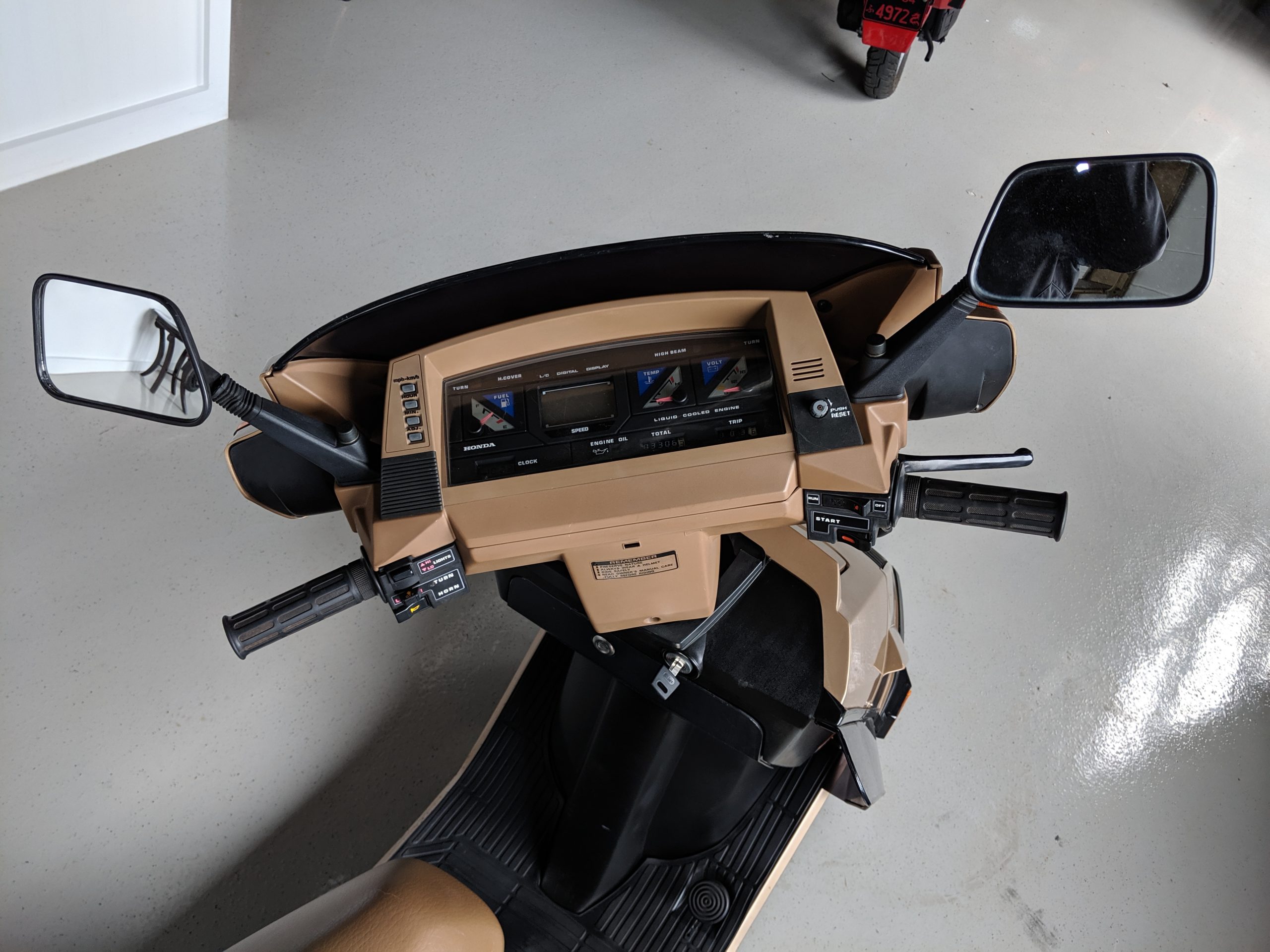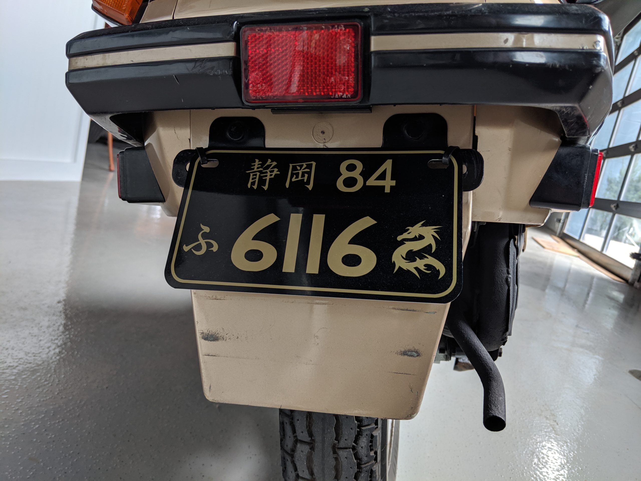 - Custom license plate: symbol for the prefecture, Shizuoka, where the Honda factory that made Elites was located; the year made ’84; Japanese Kana text symbol “Fu” meaning fortune or good luck; last four of the VIN 6116; dragon icon