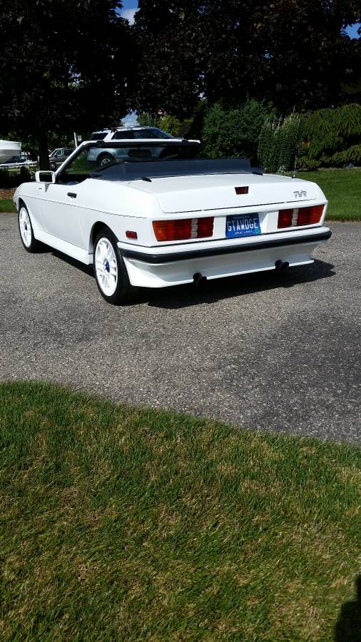 “1987 TVR 280i. One of the last one imported into the states. (Different ground effects). V-6 Ford. 26,000 miles. Car has been stored in climate controlled storage for the last 13 years, but driven a couple weeks each year during the summer. AUTOMATIC transmission which drives way better than a stick. (I know, this is my 3rd TVR). Team Dynamics Racing Wheels (have stock wheels and tires). Fully adjustable Spax shocks. Factory MOMO steering wheel. Custom exhaust. White with Navy Blue top and interior. Never driven winters. VERY clean underside too. Just tuned up with new plugs, cap and wires. Very fun car to drive. Lots of looks and very reliable. Very nice car, just needs a little attention. $15,000 or best offer. Call Mike @ show contact info between 8 a.m. and 10 p.m. EST. Call for more details. TEXTS WILL NOT BE ANSWERED. EVER.