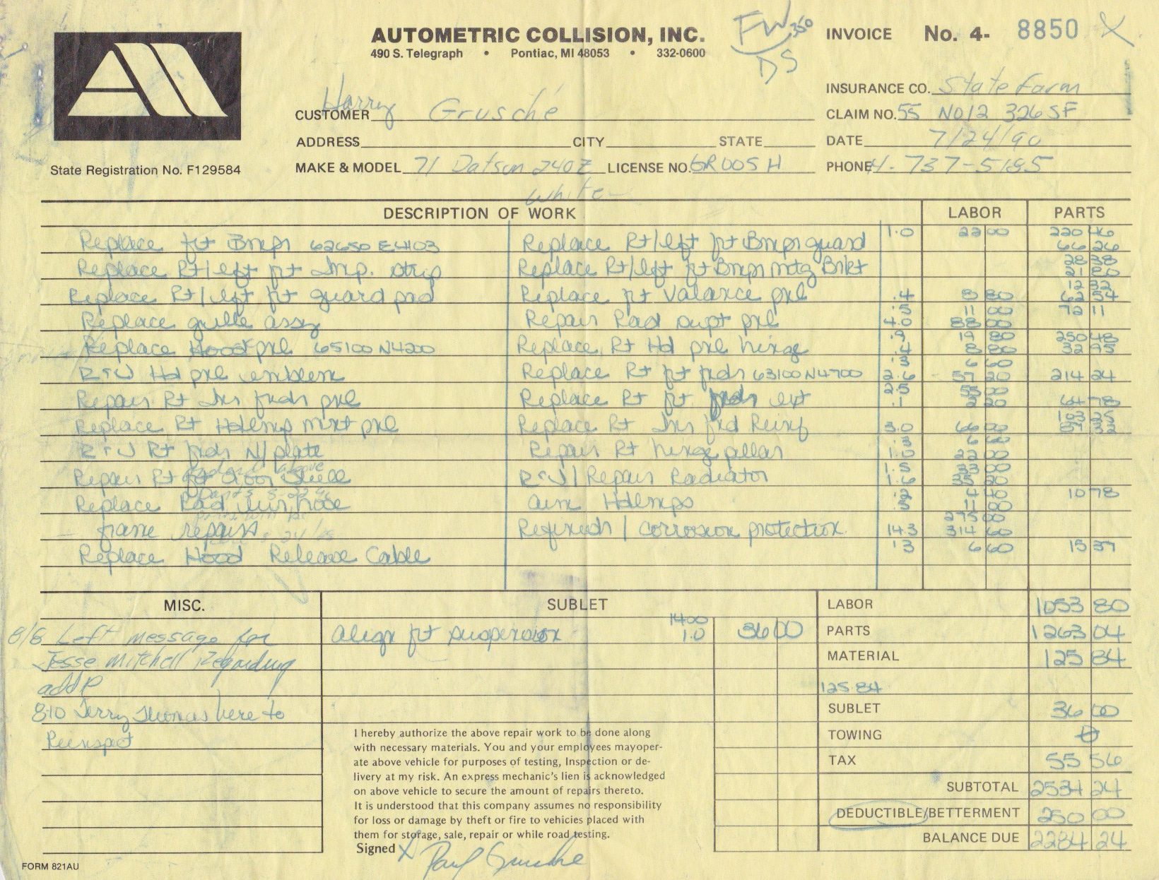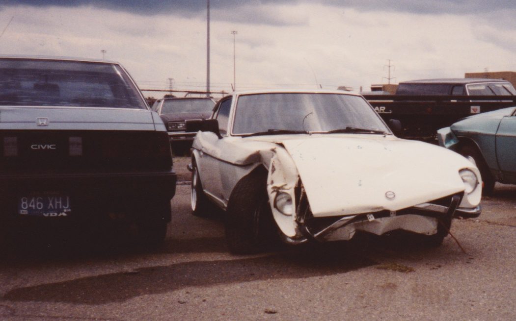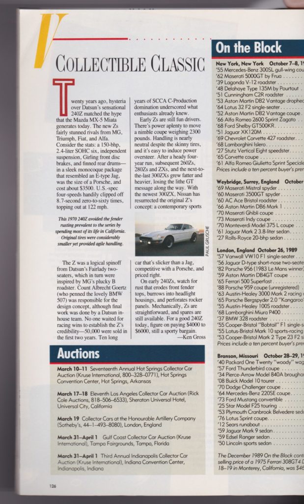 A year later after returning to Michigan, I replaced all four springs to give it tighter handling and apparently more bounce which helped considerably the night I hit a curb at 80mph, jumped the guard rail and landed 30 feet deep in the woods. I still have the souvenir owner’s manual and receipt for the damage. The repair bill resulted in a total insurance loss less than four months after it was featured in Automobile magazine March 1990 as a collectible classic. A bought and restored a second 240Z in 1996-97, see that here. It was deep green, original interior and retained original dealer installed mag wheels. In 2002 I sold that to a collector in Georgia.