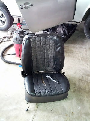 The seats were covered yet the passenger side was perfect underneath. However, the driver side tells the tale of much butt causing a rut. To be expected at this point in its life as the cushion loses pushin’, the vinyl stretches longer and lower finally giving way in the middle. I’ve gone through and given the seats a good scrubbing, polished the chrome side brackets, drilled out a broken mounting bolt and anchored a new bolt in, plus lubed things.