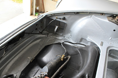 Remember the “while in there” from last week? It also included painting the entire trunk and smugglers box with silver POR15 up to the slope of the fire wall. This car does not have original front fenders, hood or front pan. Rust is still evident, silver over spray abounds or it was still black paint and the job welding said pan together was not stellar. The spare wheel has been scrubbed clean, batteries installed and miscellaneous wires rubbed free of some dirt and over spray.