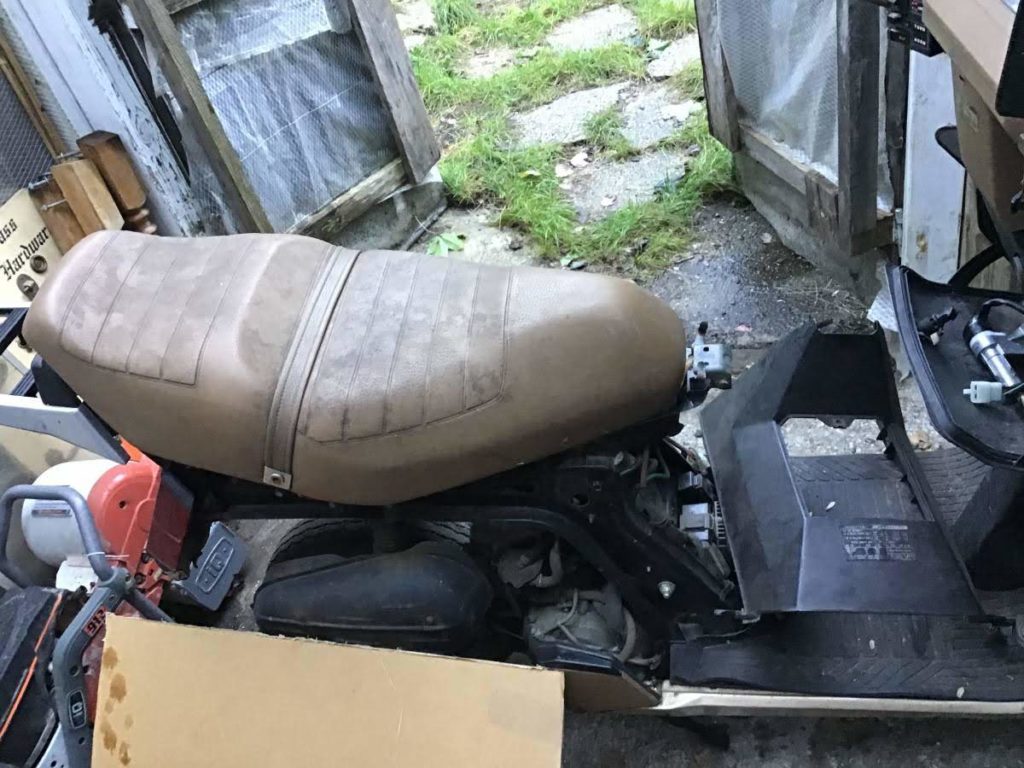 This basket case was on Craigslist last summer in Grand Haven, the west side of Michigan about 2 1/2 hours from me. I stared at it everyday for a week before I called. It hadn’t run in years, had no key, was clearly stored outside and was missing who knows what although the owner said it was complete. I lamented for another six weeks then called the guy again and struck a deal on the phone before driving out there to get it. He said he’d sell it for what he paid, $300. Done. I’ll tell you why I thought it would be a decent bike worth saving. The seat wasn’t ripped and it only had 3,300 miles. Typically you see scooters with recovered seats or they are held together with duct tape. I figured this one lived an easy life, despite its current condition, and had potential. Getting into it at home, I realized it had been in a front end collision and all the front panels were cracked and warped. To make matters worse, whoever followed behind the drove-it-into-a-wall-guy, forgot to stop and rammed Goldilocks from behind cracking the license plate holder in half. Suffice it to say I see why it was parked and forgotten. I had my work cut out for me.