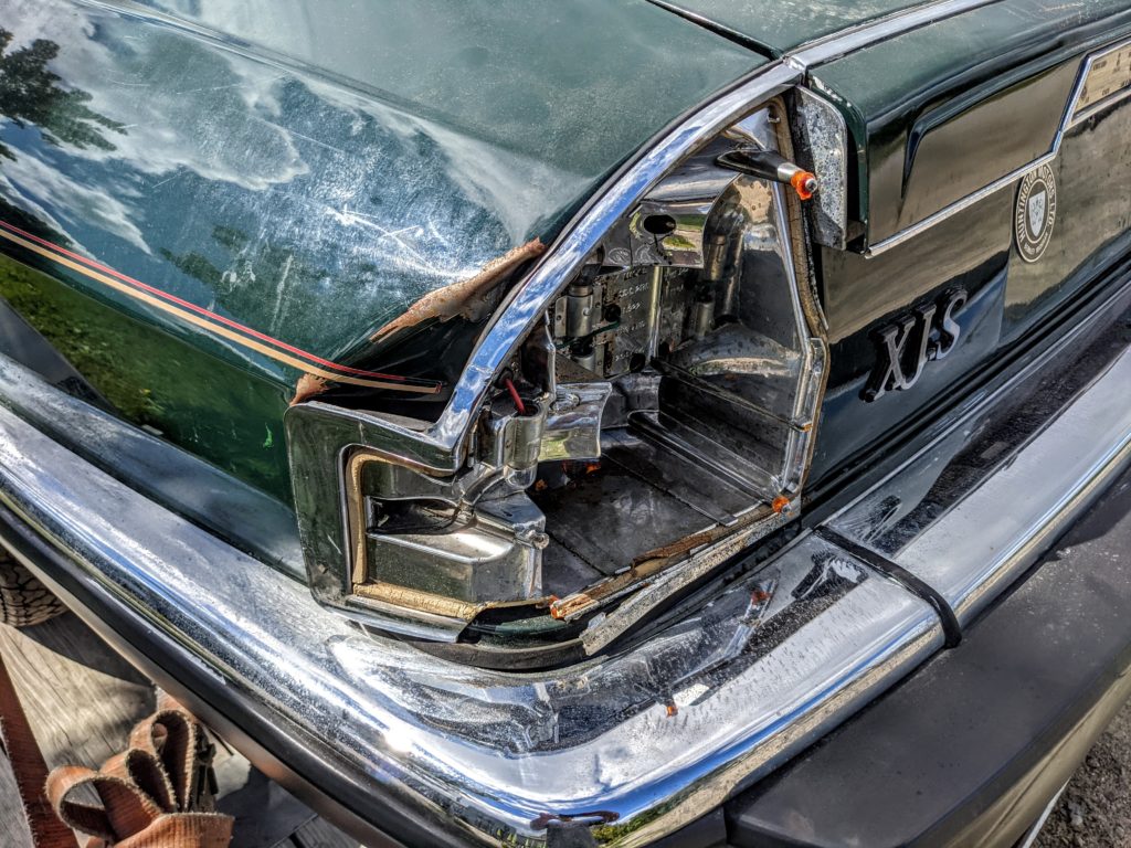 I used the rock-chip touch up method for a big divot. Blend it the best you can, so from 10 feet you don’t really see it. At this point, I just don’t see the car being worth it to strip the panel, paint and redo the original pin striping. There are so many other things I need to focus on to get this back on the road. Cosmetically, this car is alright even with me giving it the hammer time. Which BTW would have turned out slightly better but there is a metal panel for mounting the tail light right welded in about 2/3 into that bend.
