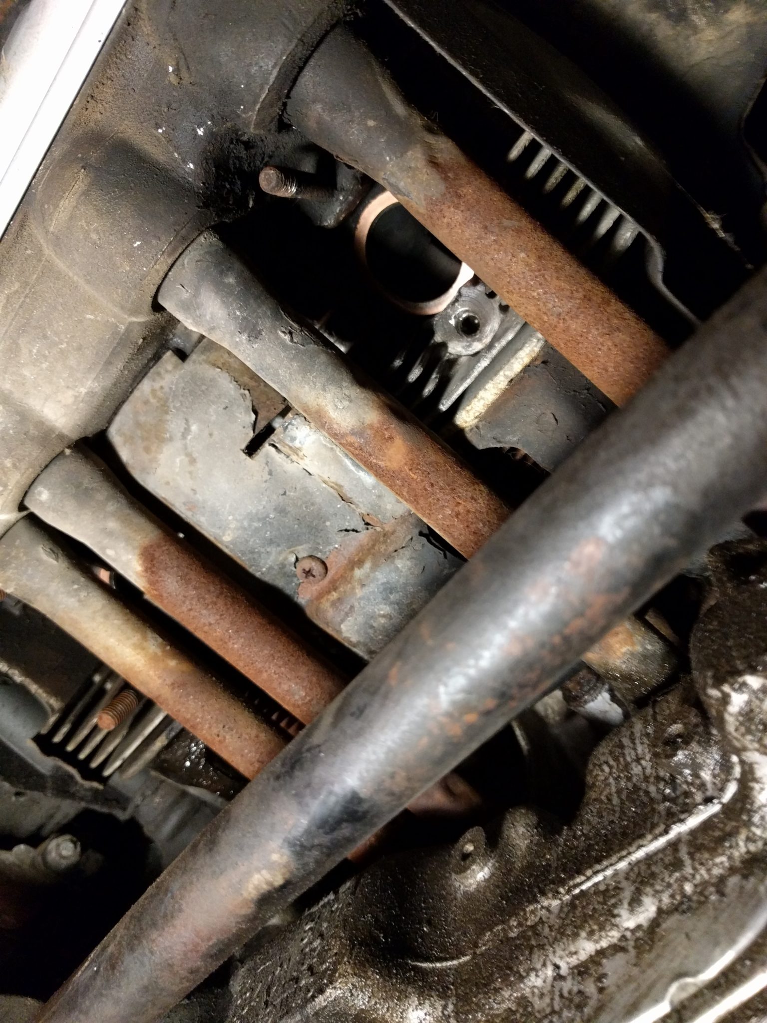 When does a Porsche sound like a VW? When it’s a 914. When does it sound like a beat up VW Bug on the way home from a Grateful Dead lap of America? When four out of eight exhaust nuts or studs are missing. I thought it was a simple hole in the muffler making the racket. Jim Beam was I in for a treat. I pulled the passenger side heat exchanger hanging by one nut, cut the exchanger part off because it was banging around and rusted beyond use. Then blanched the copper exhaust gaskets, sanded them flat and reinstalled with new exhaust stud and nuts.