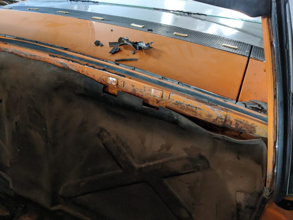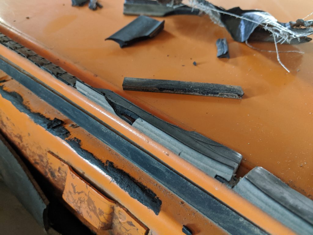 I spent a big portion of my Sunday taking out the interior of the 914 and replacing the putty to seal in the rear window. The glass worked itself loose years ago. It rattled and let in dust and noise every time you drove down the street. It finally got to me as did the chewed up window-to-engine lid seal. Having the glass out was a huge advantage to prying off the engine lid seal. The metal crimping was jozzled free the easiest from inside the car pushing it out. Reversing the order was no biggie. And now I diggie it.