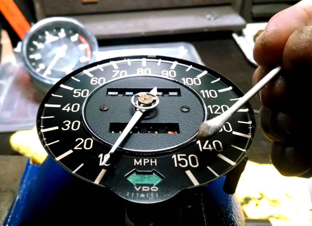 The gauge you may recognize as looking exactly like a 911 speedometer. They are the both VDOs and very similar. I bought the 1970 BMW 2800 pair, tach and speedo, off eBay on a whim to restore and sell on. Per my usual restoration of gauges, I pull them apart, paint the rings and needle, clean the face, replace the faded plastic colors for turn signals, high beams and the like while finally fixing the odometer if needed. Test everything, clean the glass and reassemble.