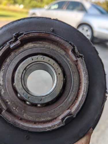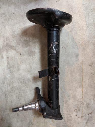 The final pieces of the completely rebuilt-front-end-puzzle are new shock tower mounts. Shouldn’t be a big deal. Shock mounts are like $40 bucks a piece right? Nope. $300 a piece. This four door saloon doesn’t have a typical ball joint set up for steering. The entire tower rotates at the top via a bearing pressed inside the mount. Since all this rubber is close to 50 years old and one bearing race was rusted out, I ponied up the cashish for two new ones… plus dust caps… plus a new spacer plate… plus another set of threaded nuts…