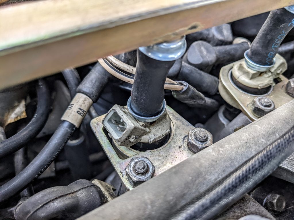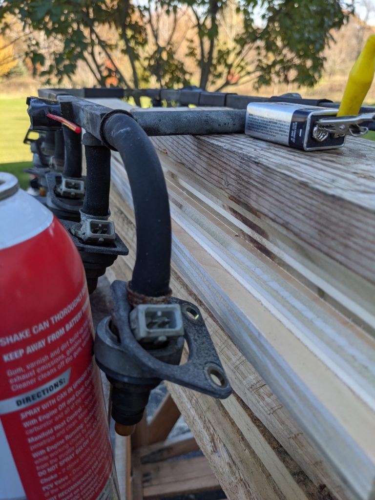 I was proud of myself for making a cleaner system for the fuel rail. The first thing I did was use a rubber plug and drill a small hole to feed a carb cleaner straw through it. Taped it up tight and plugged the return for the rail as well. Using some alligator clips and a 9 volt battery, I clipped one end on the injector, and touched the other intermittently while pushing on the can to pressurize the system. With my third arm I held everything steady. It was rewarding to see the injector streams clean up. I really wasn’t sure how old the fuel was and if it turned to shellac. Job done.